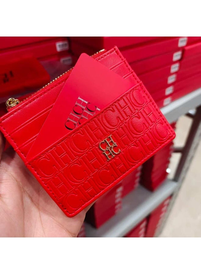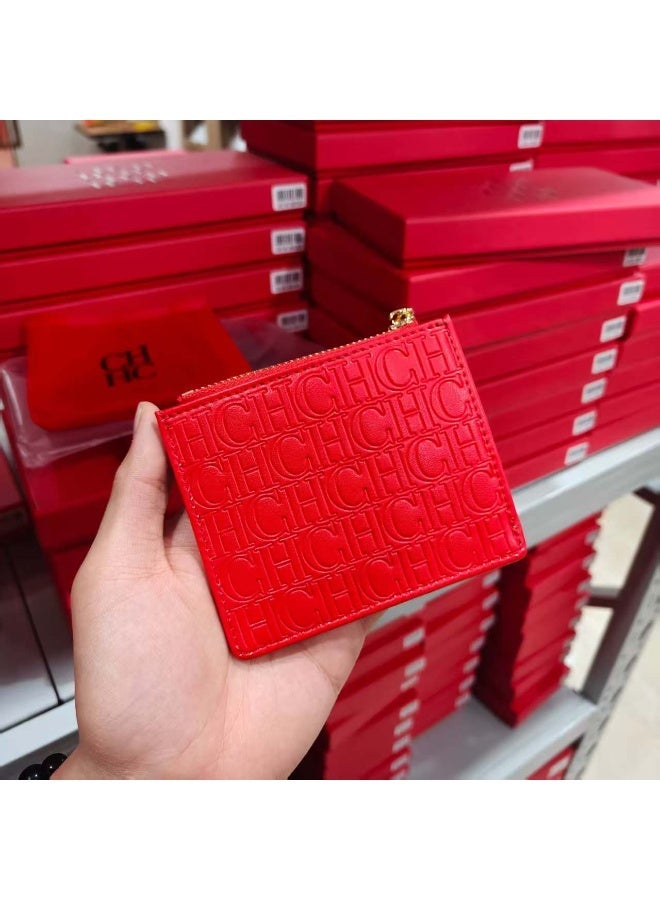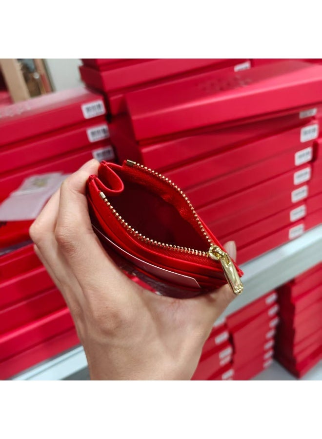 Slim red card holder with zip closure, ideal for organizing cash and cards. Lightweight, portable and comfortable, it's unisex and perfect for daily commute. Comes in an elegant gift box, suitable for gifting or personal use.