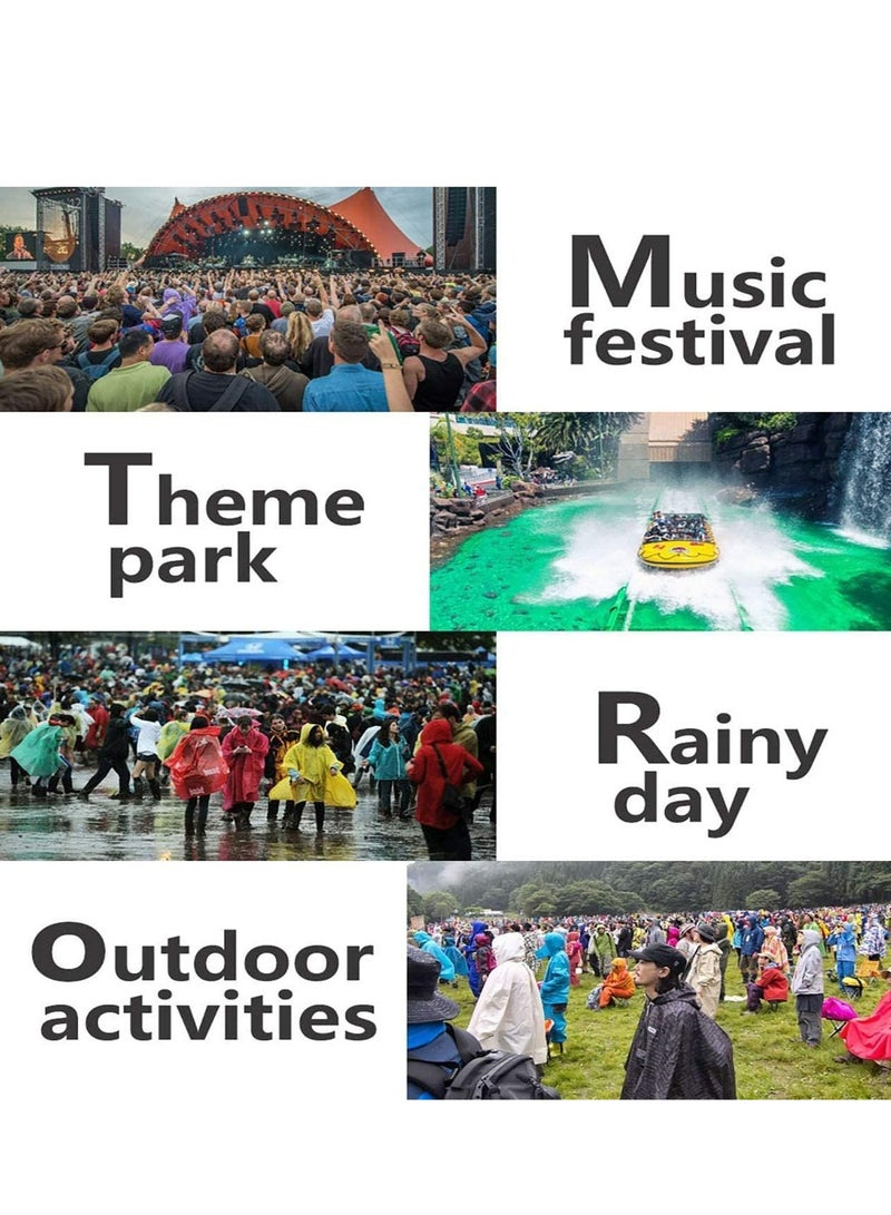 【Fashional & Practical】 Delicate clipping, big drawstring hood, double-layers hemmed, loose sleeve cuffs, snap button design, this rain poncho is not only practical but also fashional. It is suitable for all seasons, perfect to use for theme parks, outdoor shows, music festival, sporting events, camping, fishing, hiking, cycling and other outdoor activities on rainy days.