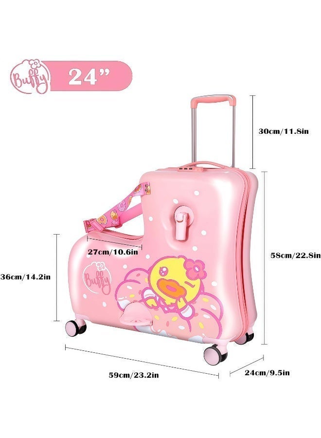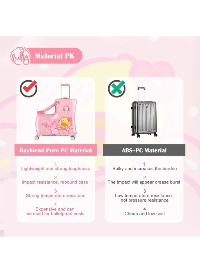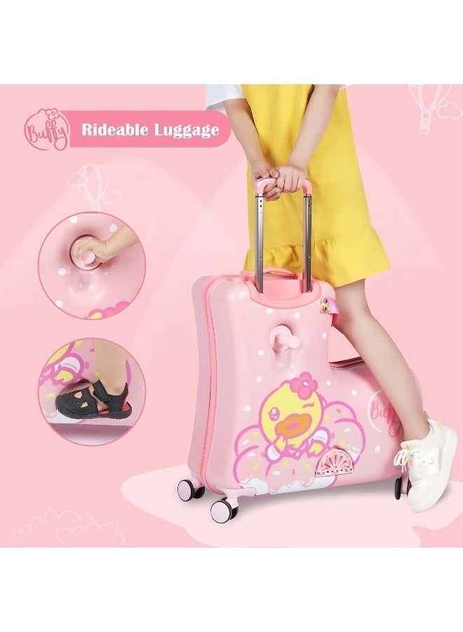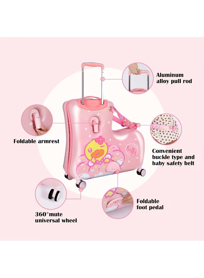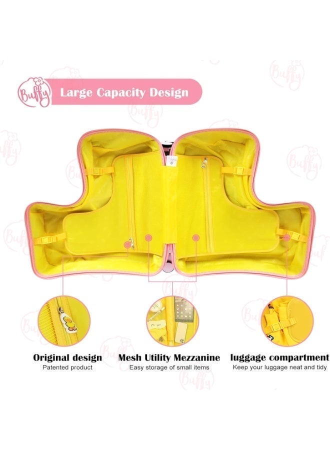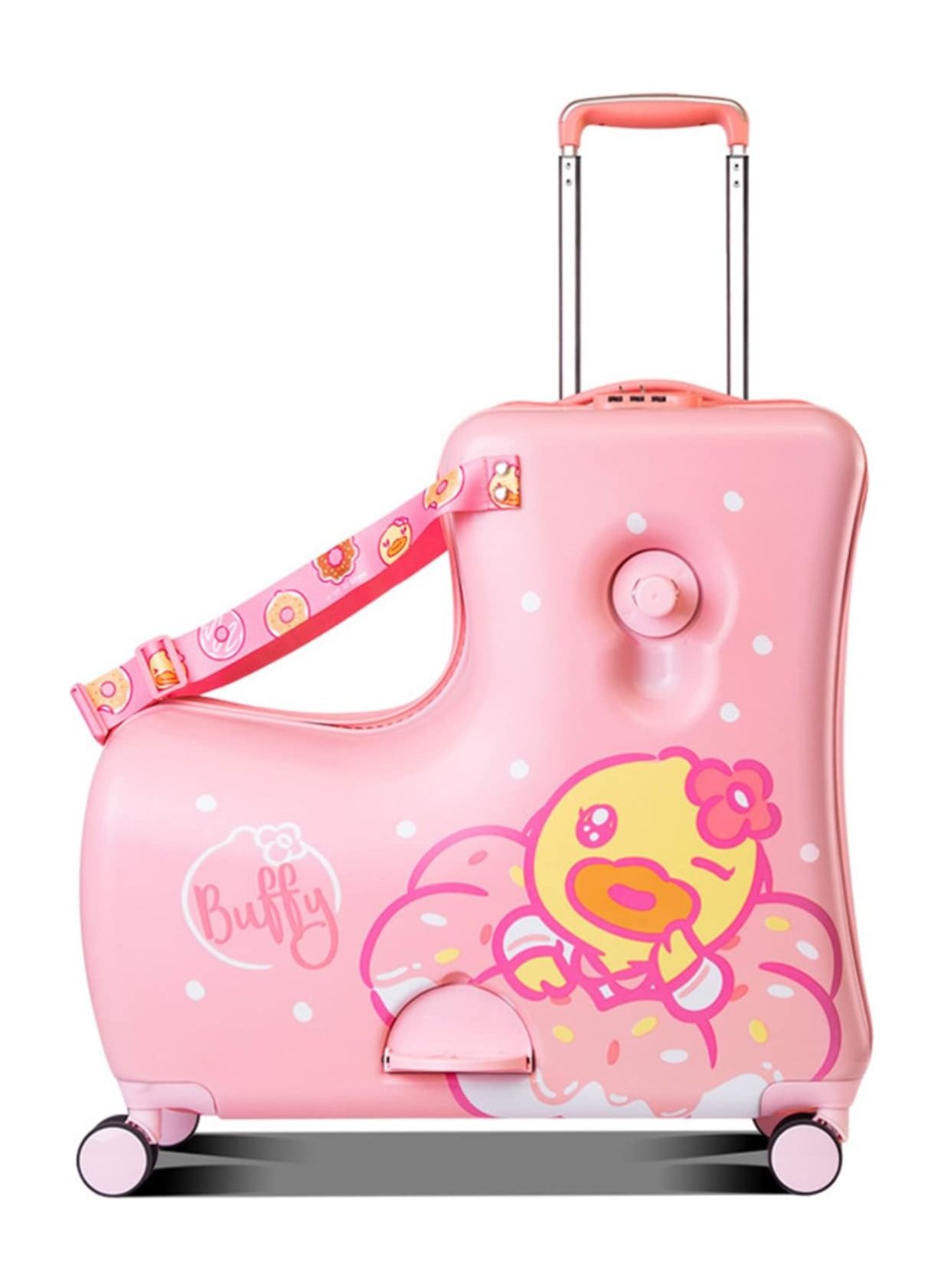 The "Ride-On Kids Luggage Buffy Duck Pink" effortlessly merges practicality with playfulness, offering a delightful travel companion for young adventurers. Boasting an eye-catching design adorned with an adorable duck motif in pink, this unique piece of luggage captures the imagination of children. Crafted for both fun and functionality, it features a ride-on design with sturdy wheels and a comfortable handlebar, allowing kids to effortlessly ride or push their belongings during travel.