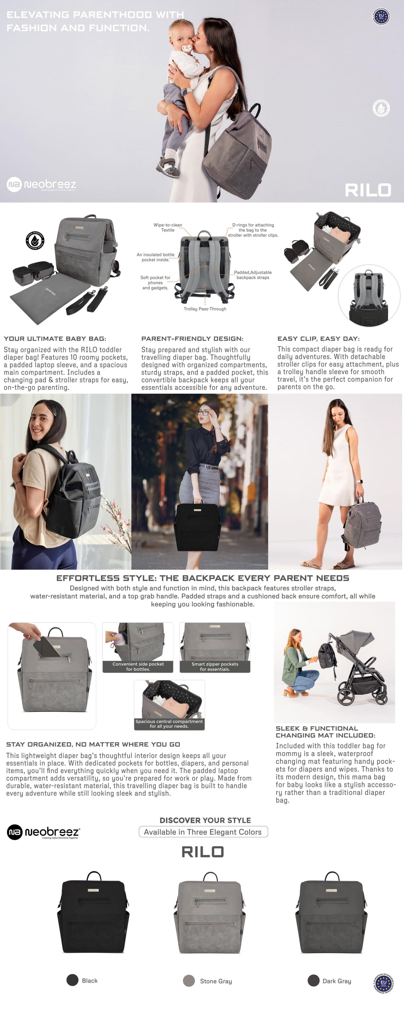 _x000B_The travel diaper backpack sleek, premium look with elegant leather accents and a choice of carry styles (backpack, shoulder, or hand) means you can confidently stride into any setting, stroller in tow. This Travel Bag with Changing Pad helps you to Change diapers anywhere, or zip through travel days using the trolley sleeve for seamless airport sprints. This toddler bag for mommy crafted for comfort with padded straps and a cushioned back, and built to last from reinforced, easy-clean materials, the RILO by Neobreez takes the weight (literally and figuratively) off your shoulders.Whether you’re running errands or heading on a family adventure, this is the mama bag for baby that adapts to your needs, keeps chaos at bay, and elevates every parent’s daily routine.