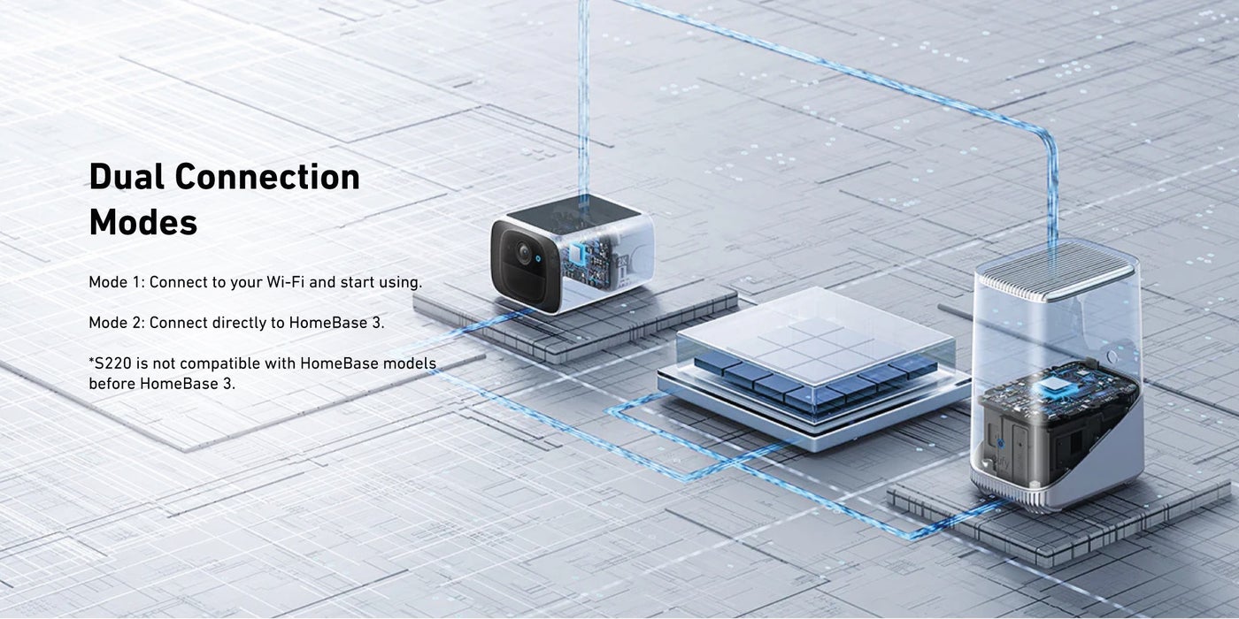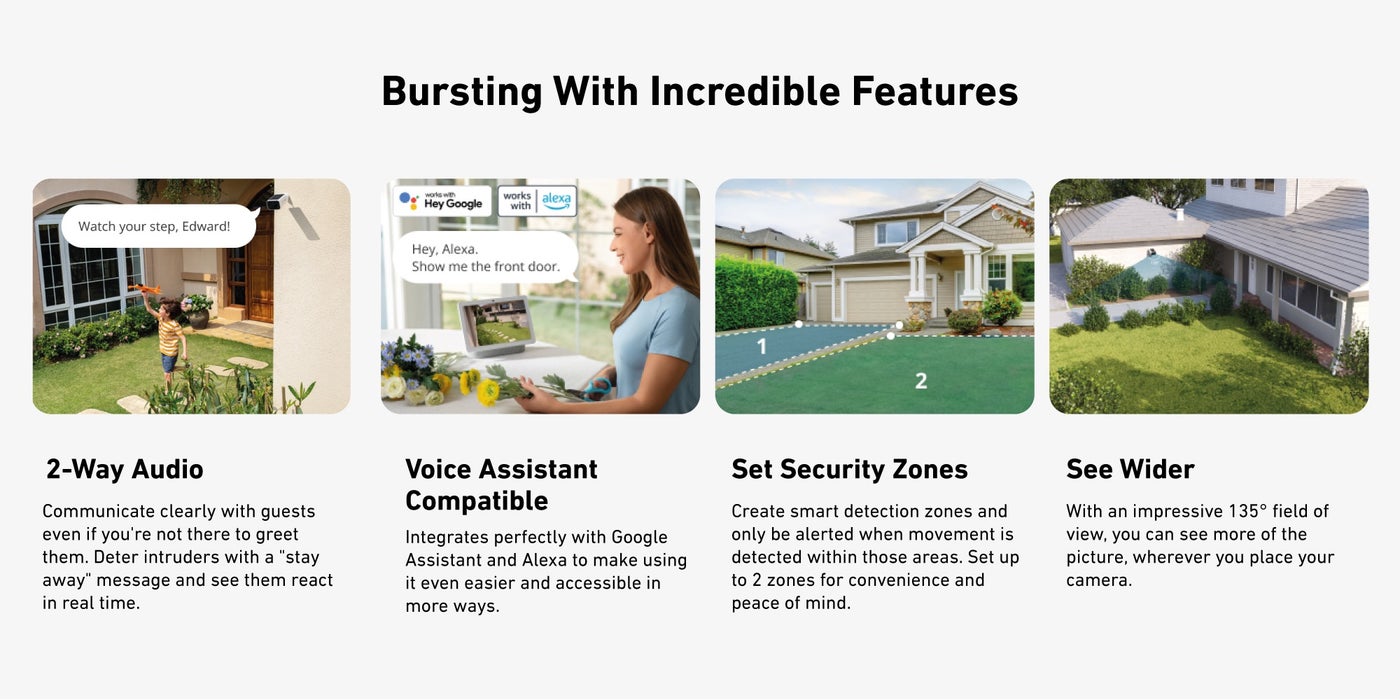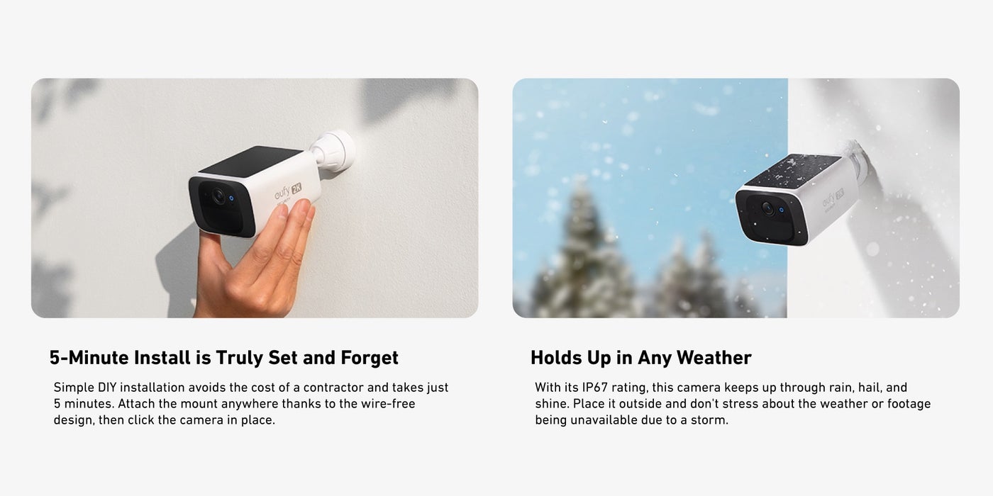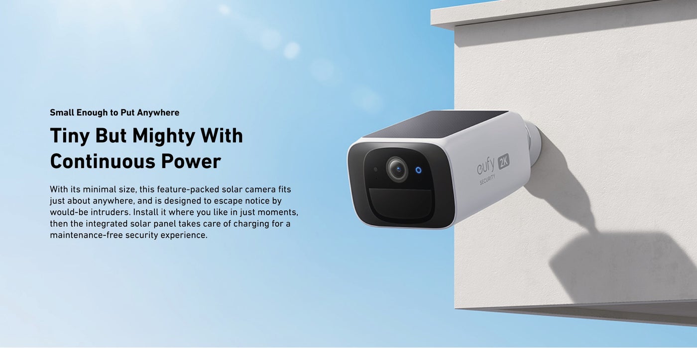 Solar Charging: Keeps the battery full, so you don't have to wait. 3 hours of sunlight daily keeps this solar security camera running. Day and Night Clarity: Infrared LEDs and an f/1.6 aperture allow more to be seen for excellent night vision. Easy Installation: Put this outdoor security camera anywhere thanks to tiny size and wire-free design. Drill one hole, once. Instantly connects to WiFi for hassle-free usage. Human Detection: AI alerts you of anyone in your yard, whether family, a courier, or a stranger. Connect to HomeBase 3 for individual facial recognition. No Monthly Fee: One-time purchase. No monthly fees or hidden costs. On-device storage and AI for complete security and transparency.