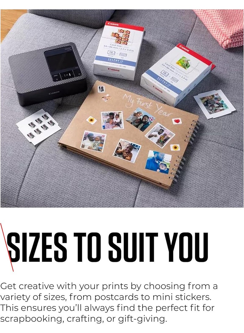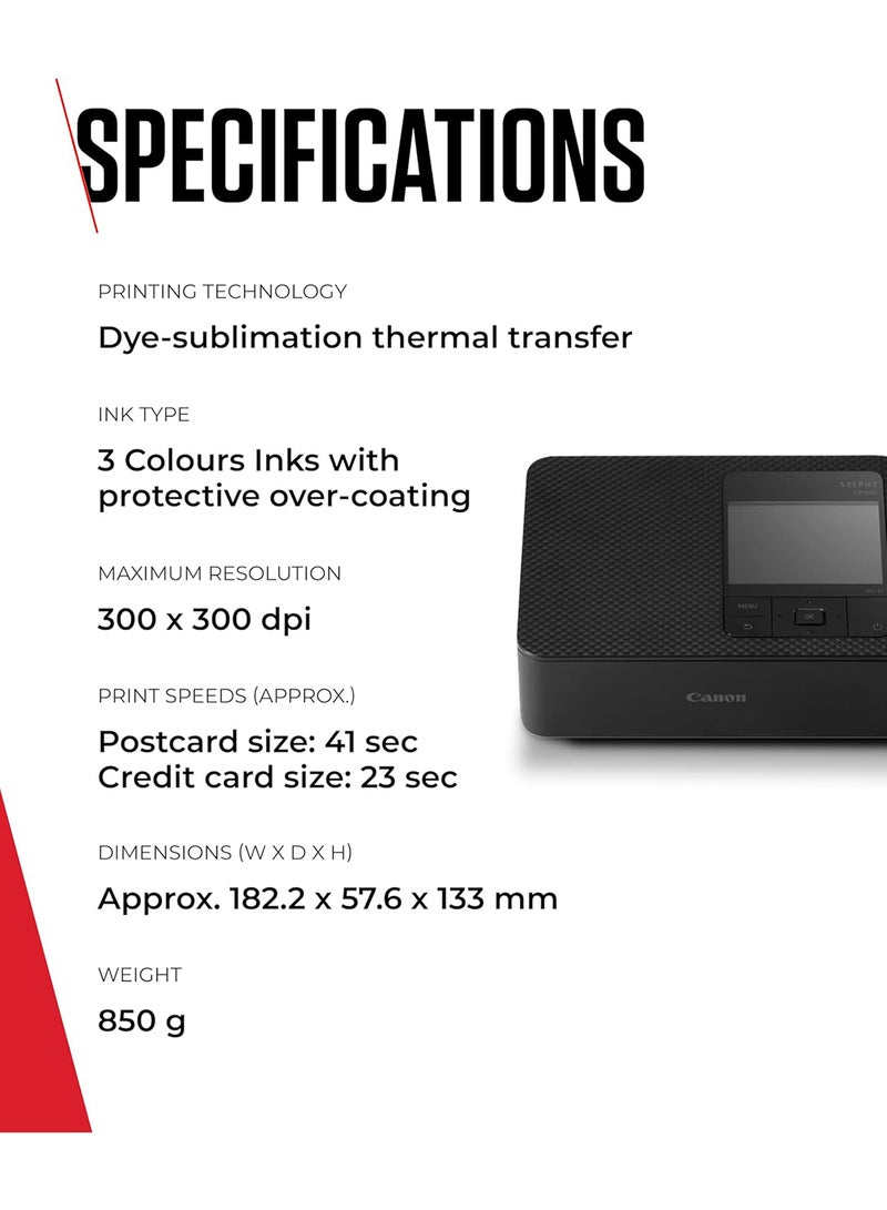| What's In The Box | SELPHY CP1500 Colour Portable Photo Printer - Black, Paper Cassette PCP-CP400 (Postcard size), AC Cable, Compact Power Adapter, User Manual |