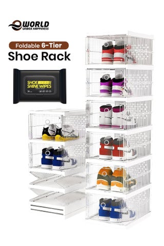 This set of 6 clear plastic stackable shoe storage boxes offers a stylish and practical solution for organizing shoes, books, toys, clothing, and more. Each box has magnetic doors for secure and convenient access, while the interlocking design allows for a fully customizable setup. Durable and versatile, these storage containers are perfect for optimizing space in any room, providing a neat and visually appealing display for your belongings.