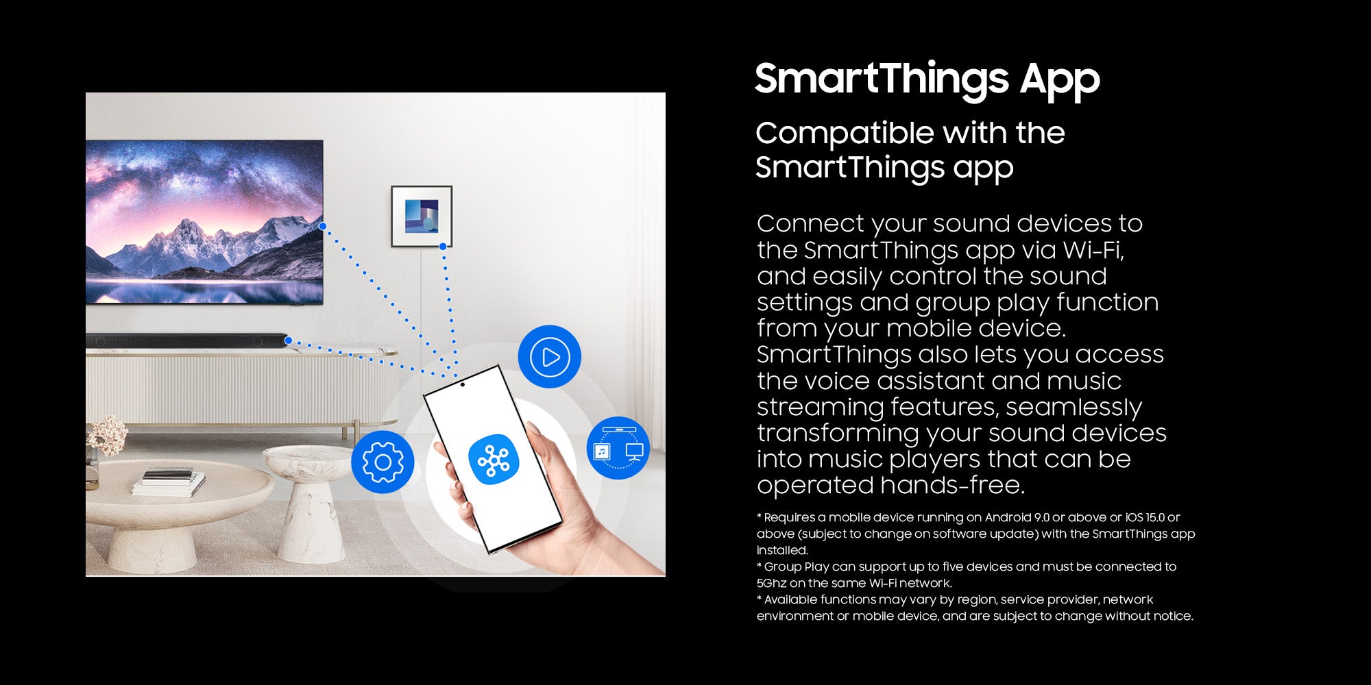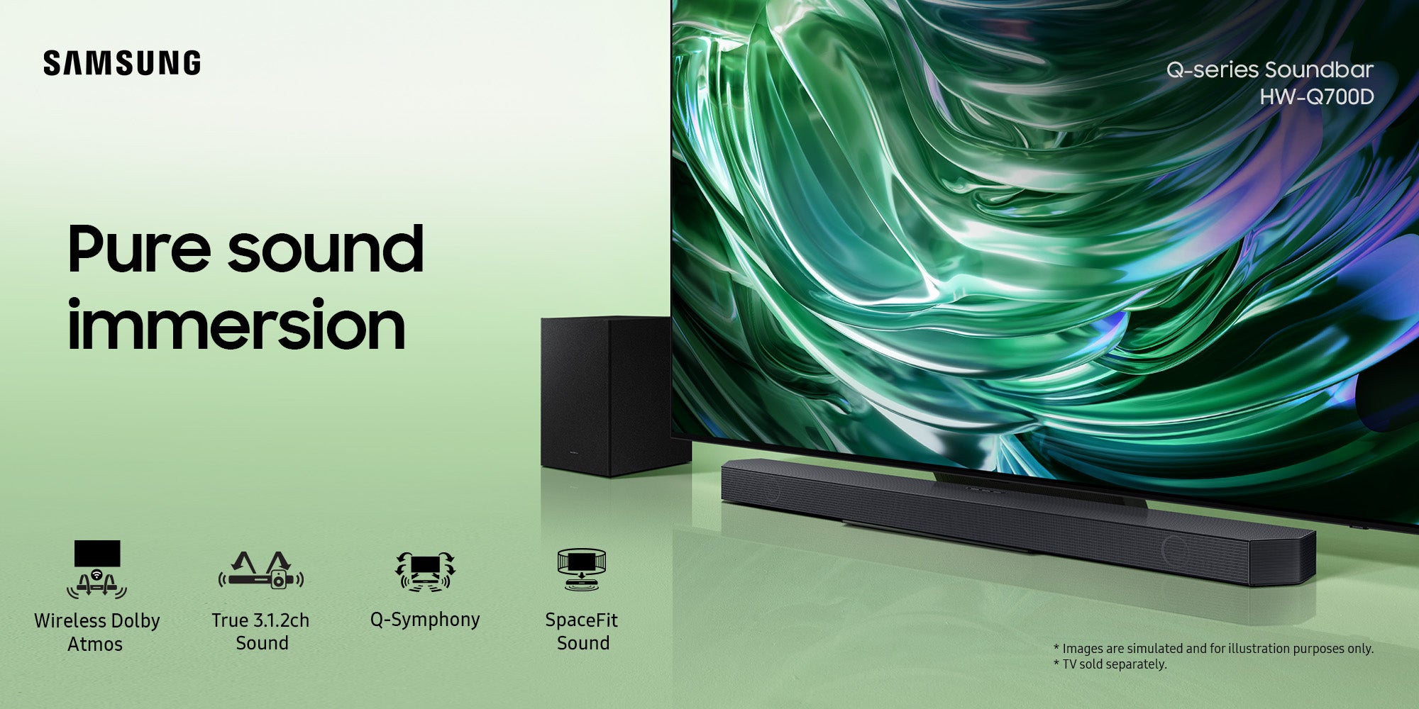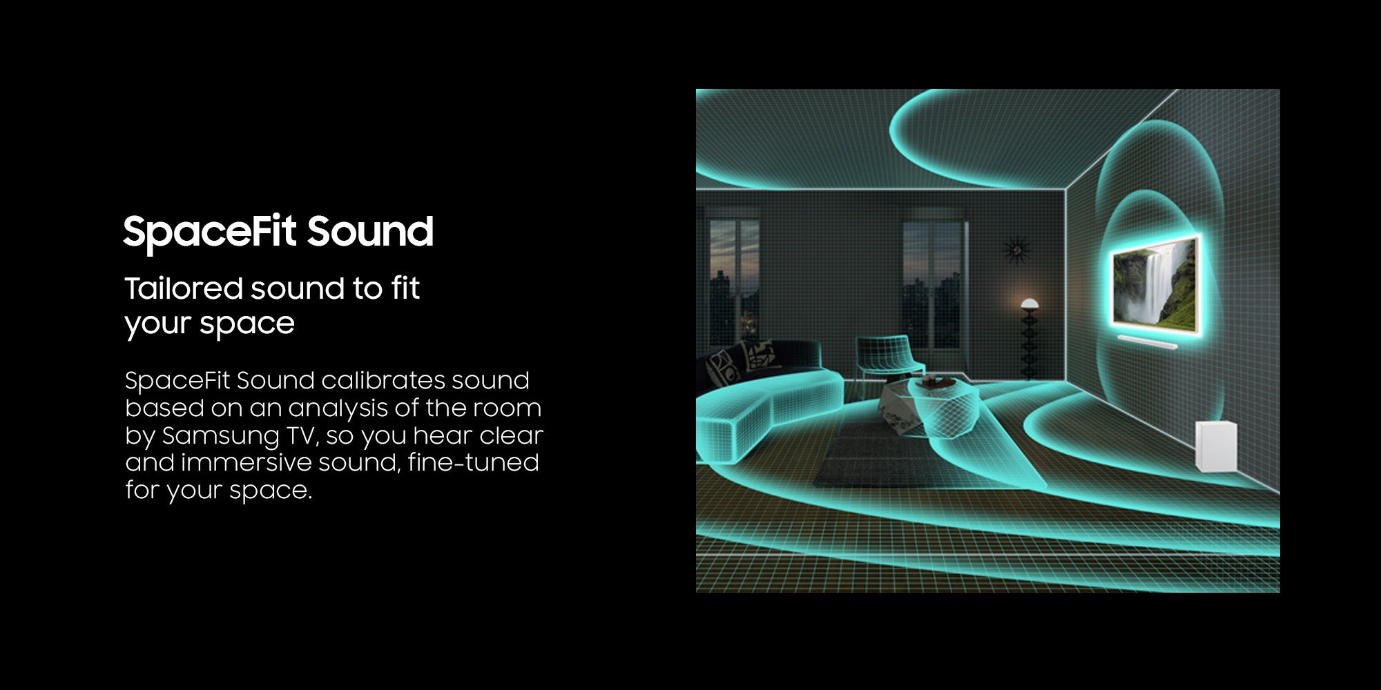 SpaceFit Sound: Samsung Soundbar calibrates sound based on an analysis of the room by Samsung TV, so you hear clear and immersive sound, fine-tuned for your space