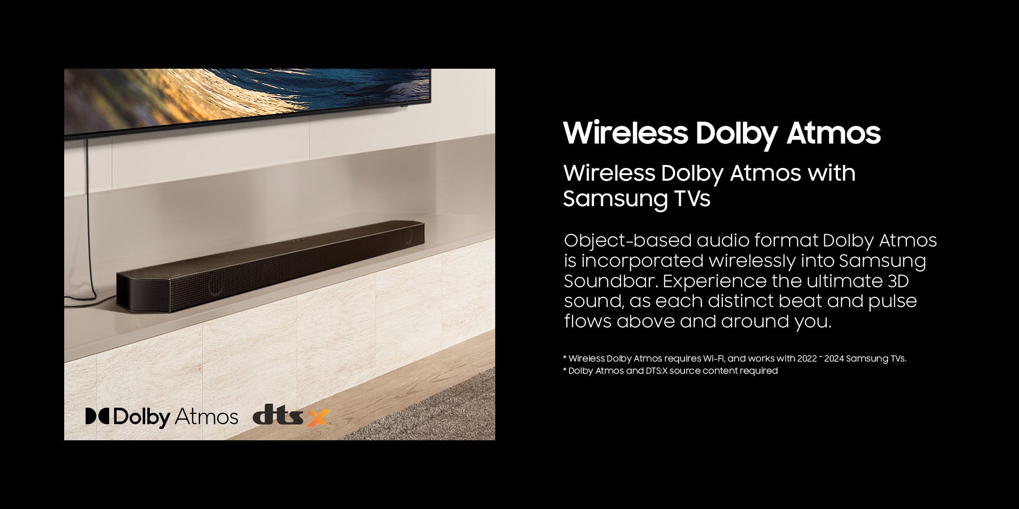 Wireless Dolby Atmos with Samsung TVs: Object-based audio format Dolby Atmos is incorporated wirelessly into Samsung Soundbar. Experience the ultimate 3D sound, as each distinct beat and pulse flows above and around you