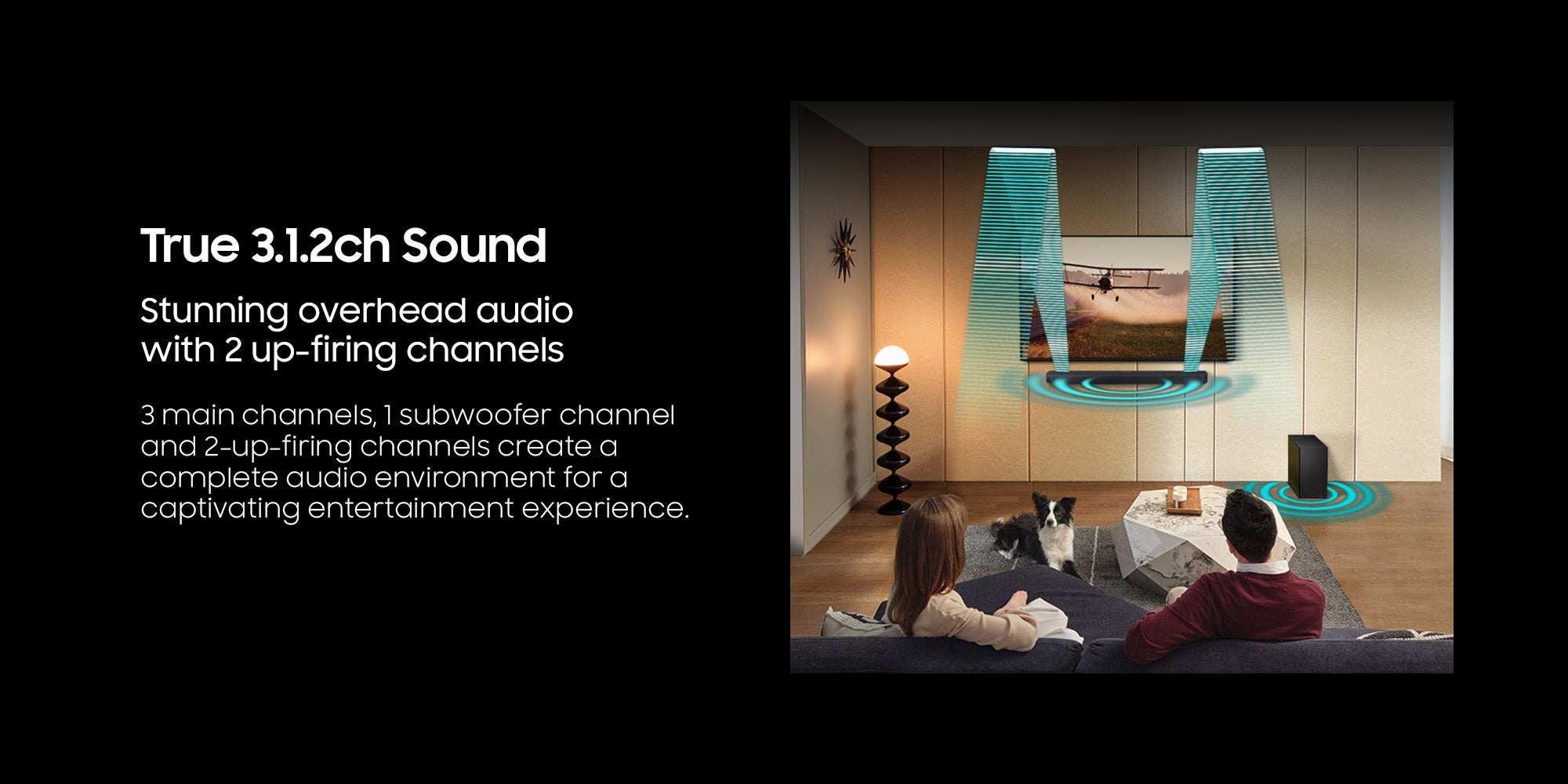True 3.1.2ch Sound: 3 main channels, 1 subwoofer channel and 2-up-firing channels create a complete audio environment for a captivating entertainment experience