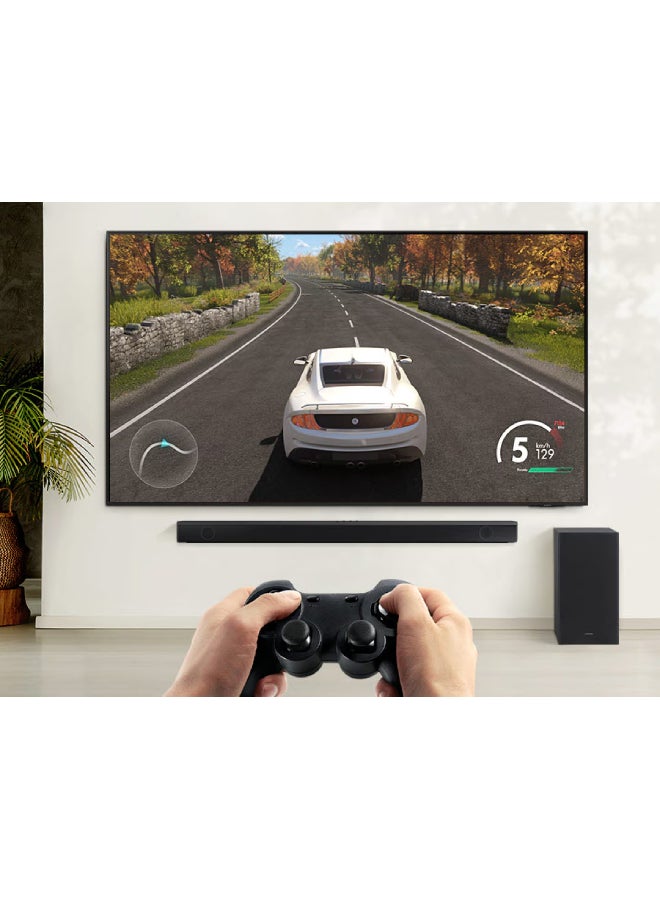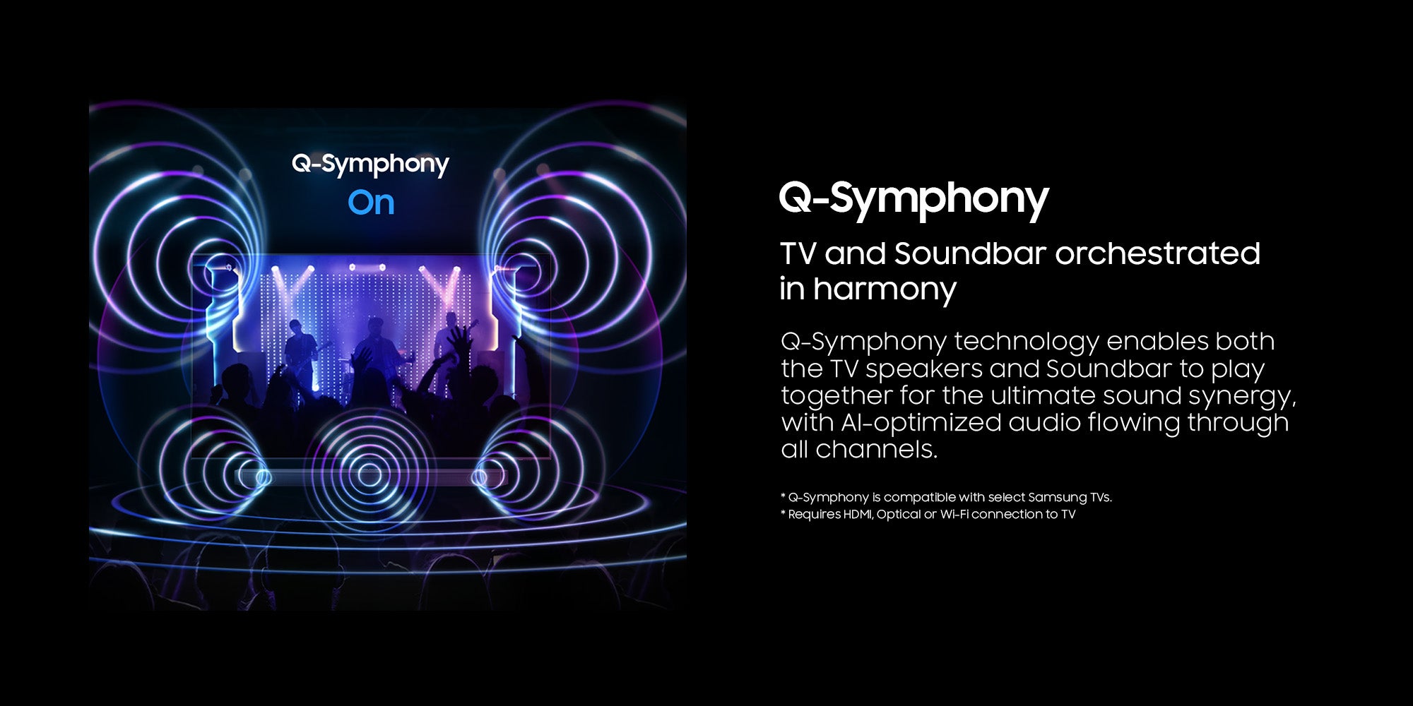 TV and Soundbar orchestrated in harmony: Q-Symphony technology enables both the TV speakers and Soundbar to play together for the ultimate sound synergy, with AI-optimized audio flowing through all channels