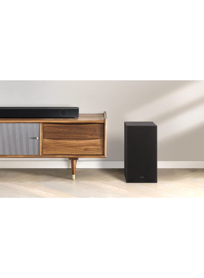 Wireless Dolby Atmos with Samsung TVs: Object-based audio format Dolby Atmos is incorporated wirelessly into Samsung Soundbar. Experience the ultimate 3D sound, as each distinct beat and pulse flows above and around you.True 3.1.2ch Sound: 3 main channels, 1 subwoofer channel and 2-up-firing channels create a complete audio environment for a captivating entertainment experience.