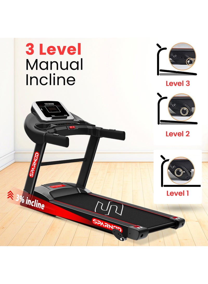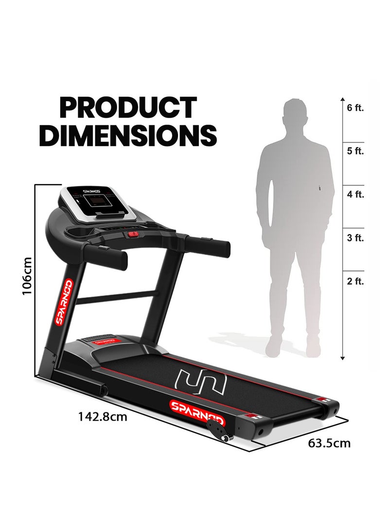 Sparnod Fitness STH-1250 treadmill allows you to exercise comfortably at home. This Running Machine is an effective way to burn extra calories and achieve a healthy lifestyle at Home. Boasts a concise and innovative design that features space-saving folding design yet reliable, sturdy frame for easy storage. It is the perfect tool for losing weight or increasing endurance.