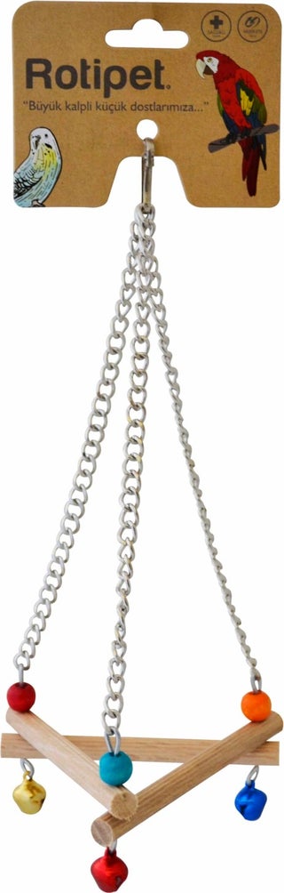 Rotipet Triangle Bird Swing 9 cm. It is wide. Its length from the hanger is 23 cm. 8mm. diameter wooden beads were used.