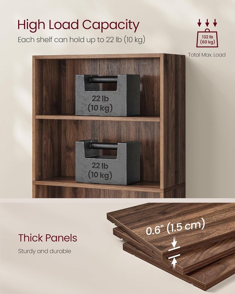 【STURDY, STABLE, SAFE】Constructed from premium particleboard and MDF, this robust bookshelf can support up to 22 lb per tier. The H-shaped structure and slot-in back panel augment stability, while the included anti-tip kit ensures safety