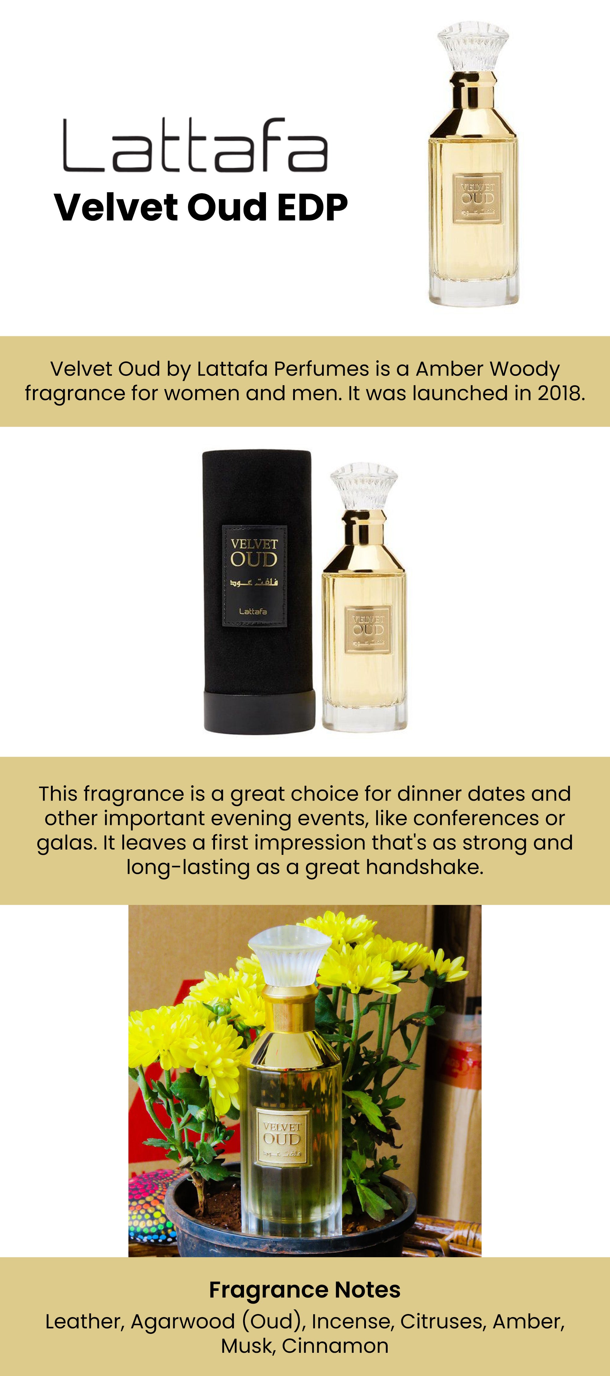 Velvet Oud by Lattafa Perfumes is a Oriental Woody fragrance for women and men. Velvet Oud was launched in 2018Lattafa Perfumes is a new fragrance brand from UAE. The earliest edition was created in 2014 and the newest is from 2021.
