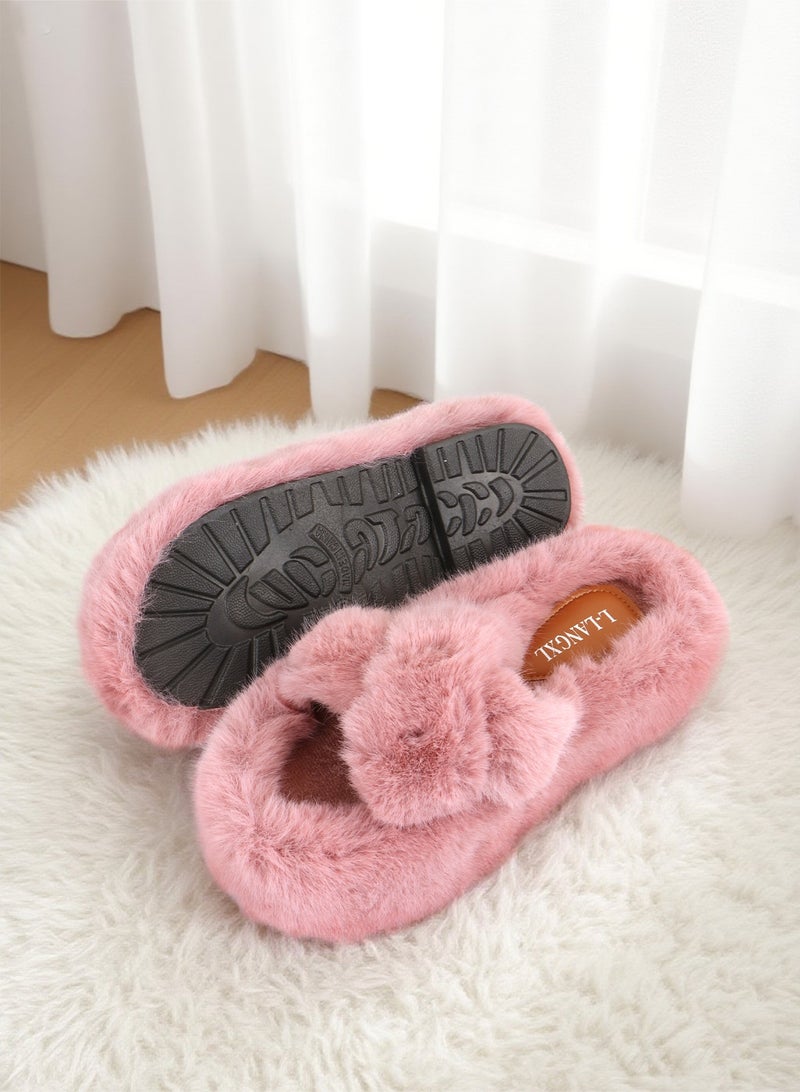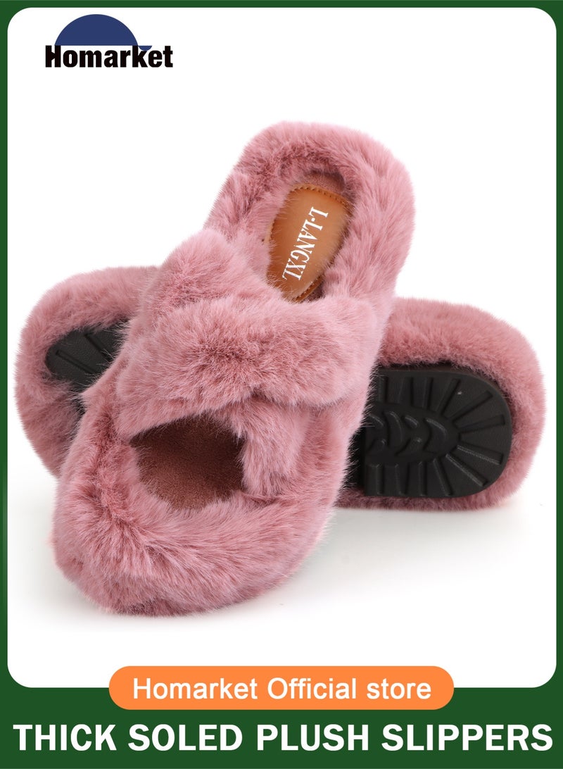 Women's Fluffy Slippers Solid Color Platform Slippers - Casual Winter Shoes Slippers, Stylish Cross Band Fluffy Slippers, Comfortable Indoor House Slip Ons Slippers - Plush Fleece Lining,Anti-Slide Open Toe House Slippers- Perfect Gift for Family and Friends,Pink