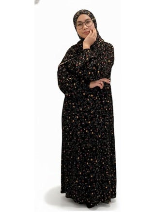 The dress features long sleeves and a loose, flowing fit that allows free movement while maintaining a modest appearance. Its elegant black base with printed designs adds a stylish yet simple touch, making it suitable for everyday salah, mosque visits, and Umrah. Practical and comfortable, this prayer outfit is ideal for women who value ease, coverage, and timeless Islamic style.