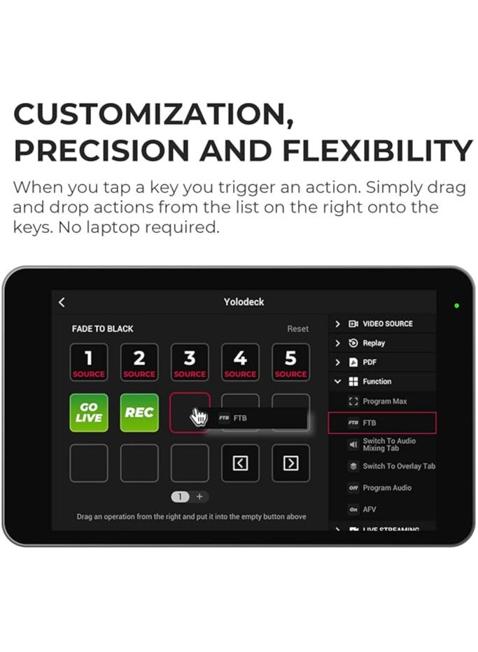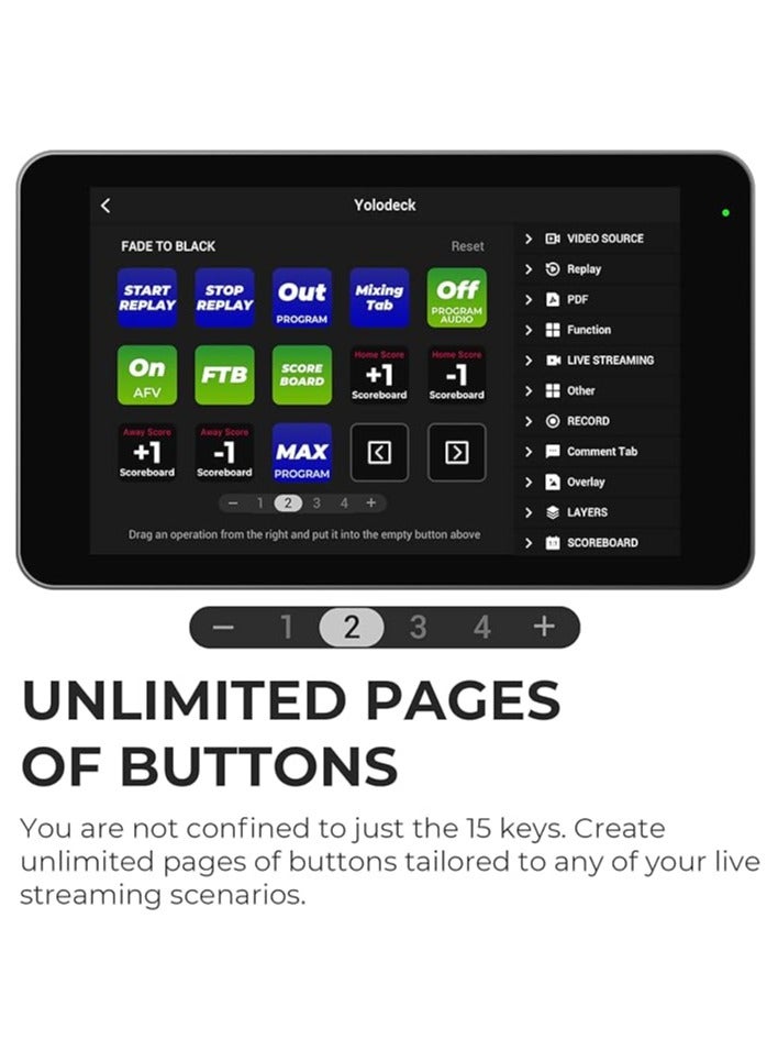 With plug-and-play USB connection and seamless integration with YoloBox devices, the YoloDeck lets streamers, broadcasters, and content creators elevate their production to a professional level. Ideal for YouTubers, podcasters, gamers, and event streamers seeking real-time control and creative flexibility.