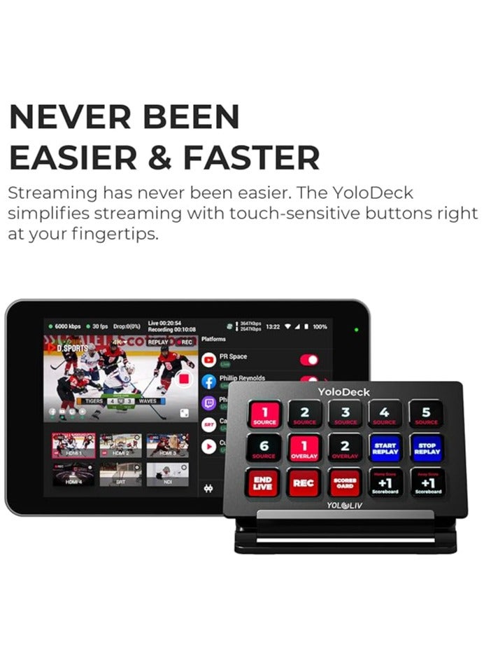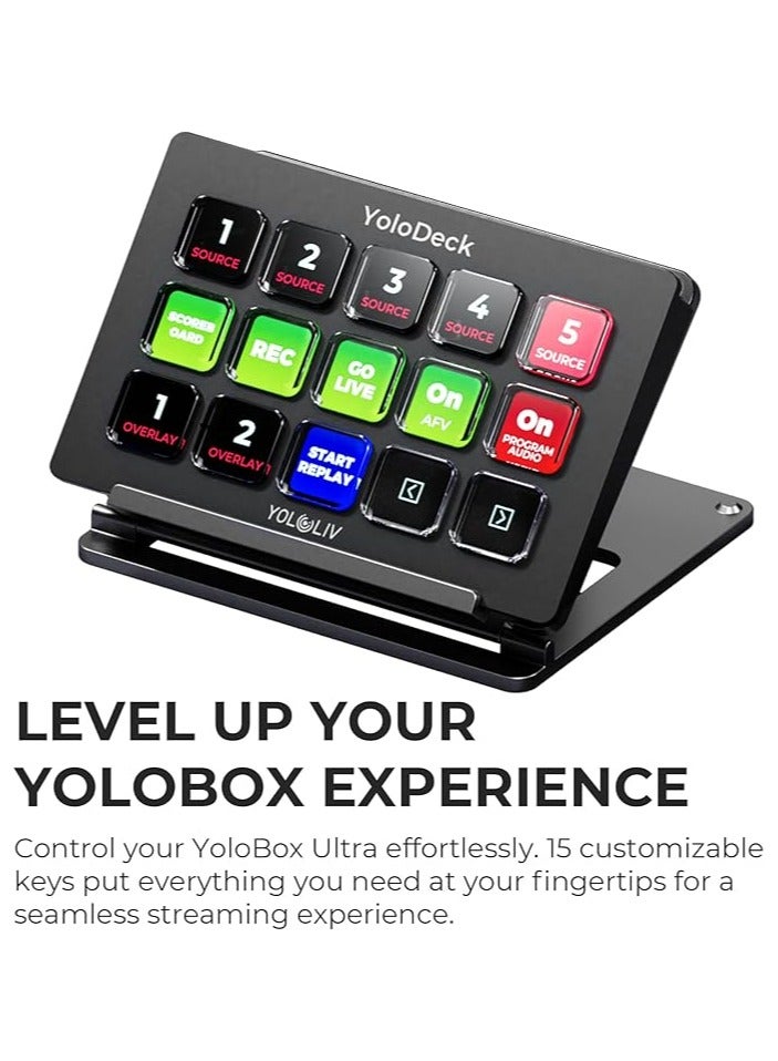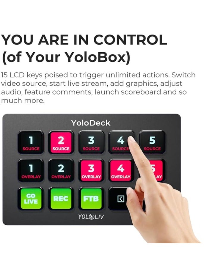 The YoloLiv YoloDeck Studio Controller Keyboard is a professional control deck designed to simplify live production on YoloBox Extreme, YoloBox Ultra, and YoloBox Pro. Featuring 15 fully customizable LCD keys, it allows creators to trigger scenes, transitions, graphics, audio, and camera switching instantly. This compact and durable studio control surface enhances workflow efficiency and gives you tactile control for smooth, broadcast-quality live streaming.