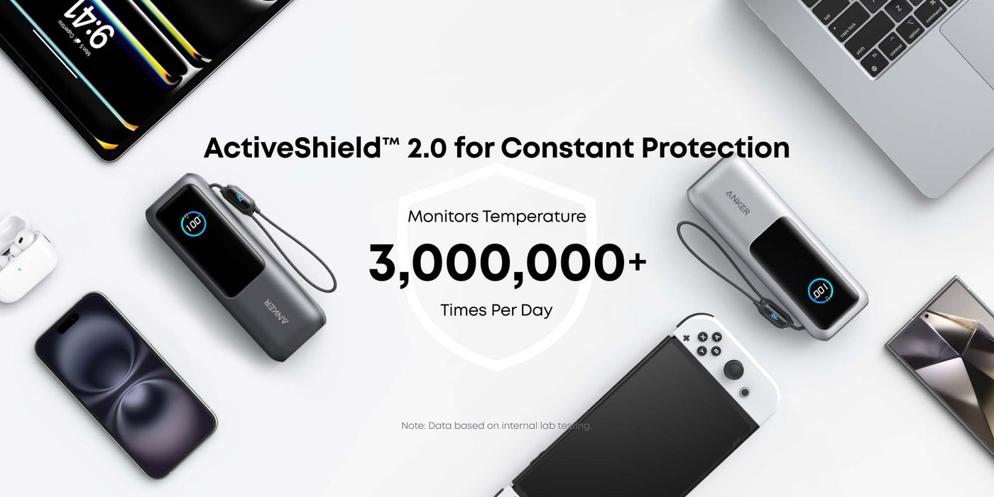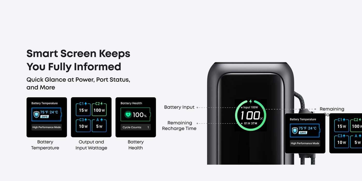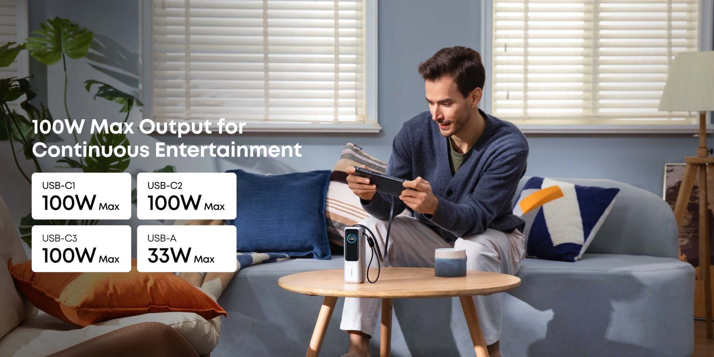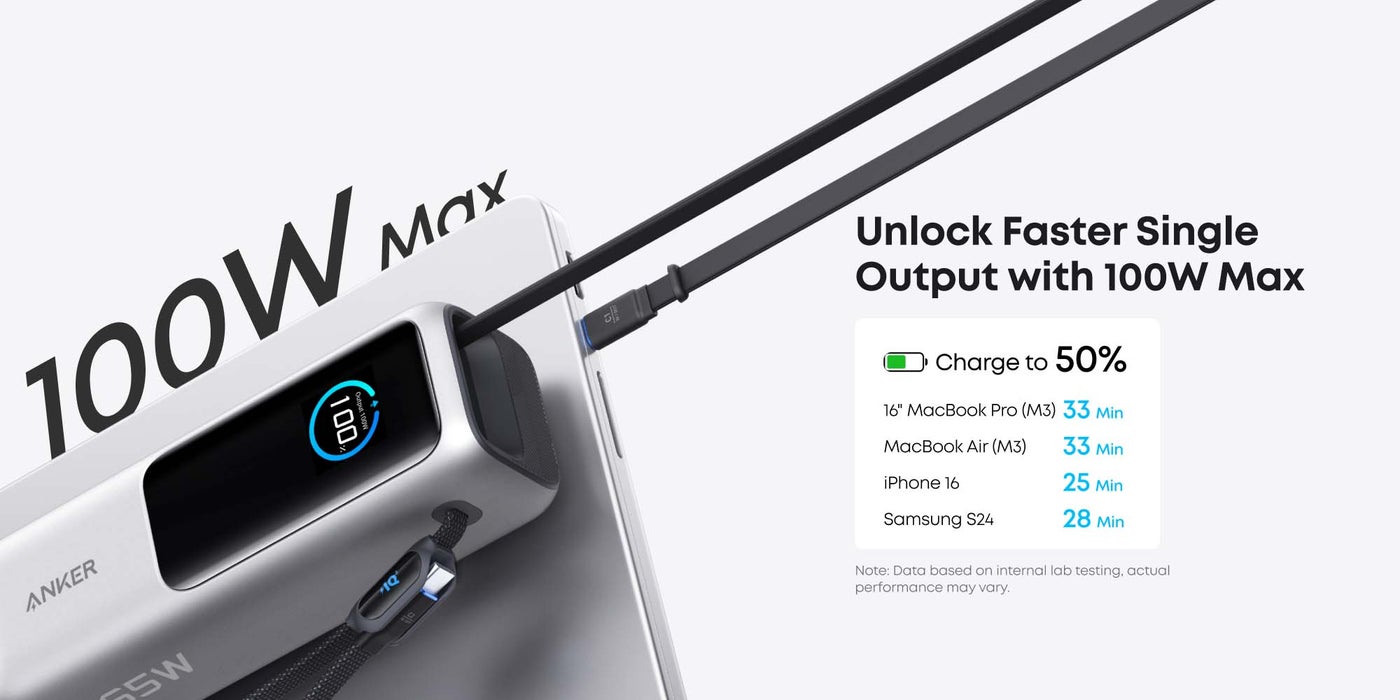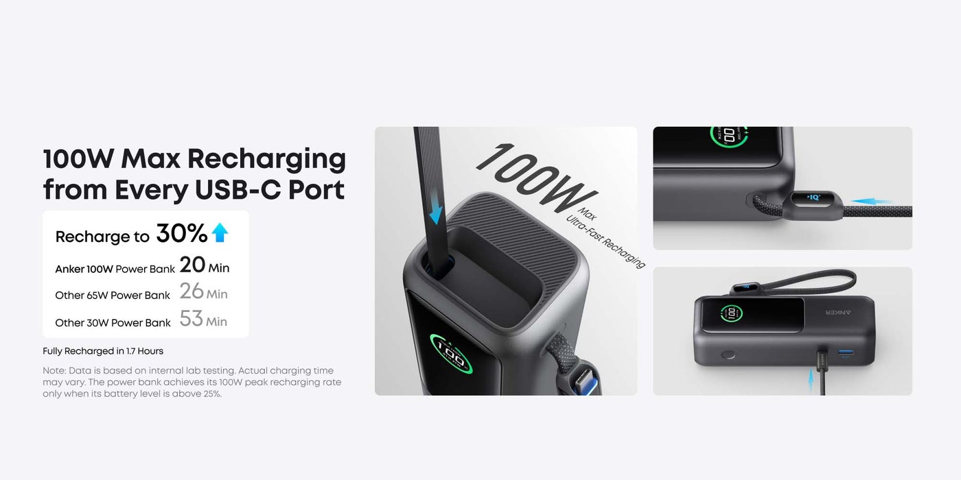 25,000mAh for Long-Haul Power: Set off on extended journeys with a huge 25,000mAh capacity that supports your devices through multiple uses, complete with 100W ultra-fast recharging that fuels the power bank to 30% in just 20 minutes