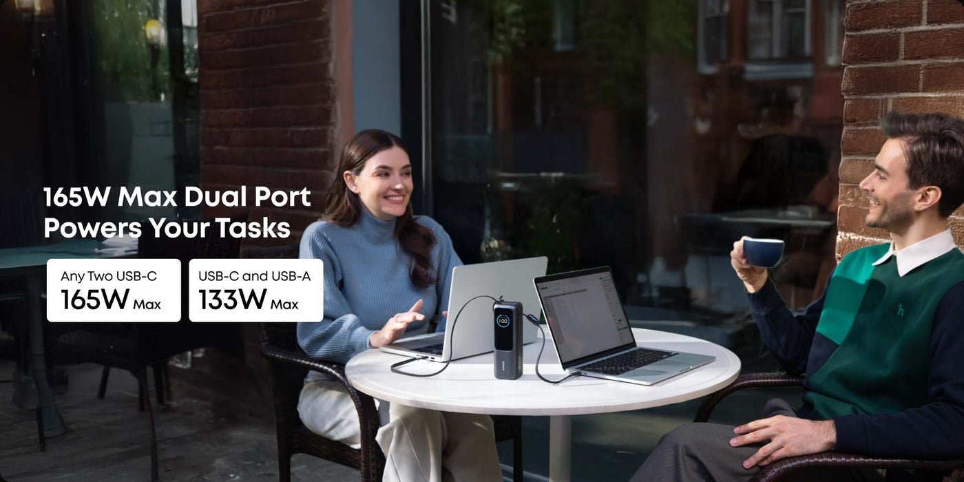 Efficient 165W Dual Laptop Charging: Streamline your charging with dual ports that offer up to 165W, capable of powering two laptops quickly to keep up with your demands. Each port delivers up to 100W, so enjoy efficient charging without compromising on speed