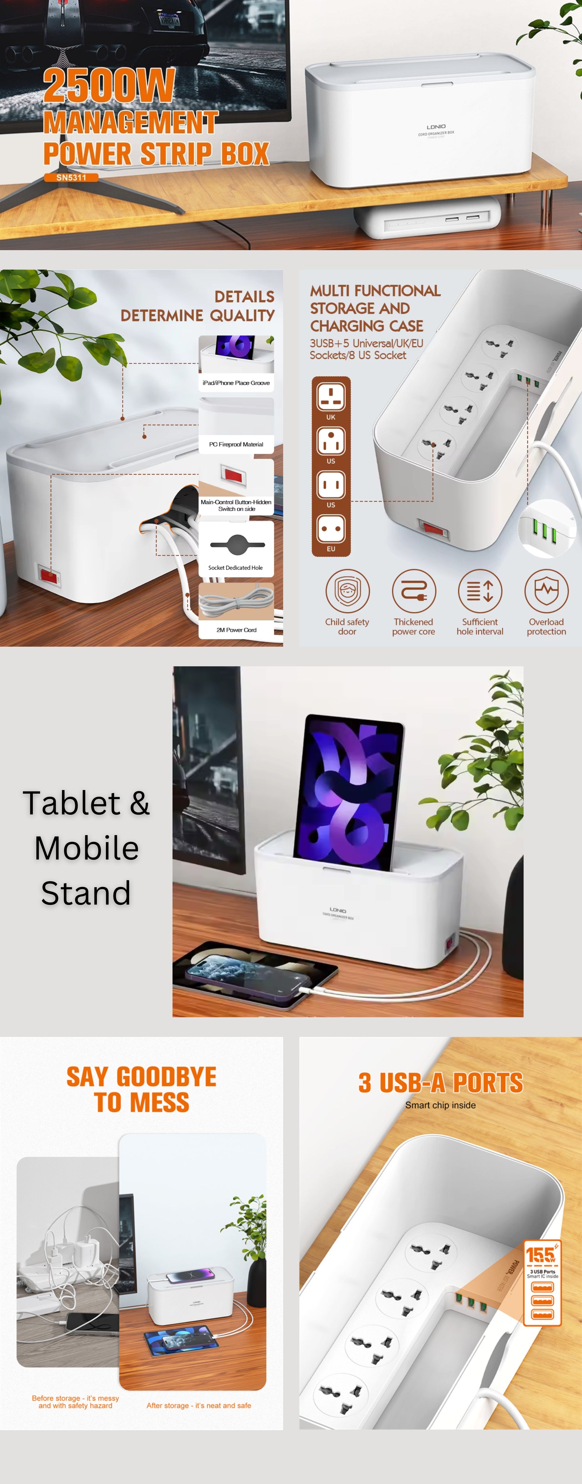 | What's In The Box | LDNIO SN5311W 5 Extension Socket 3 USB Ports Power Strip Storage Box |